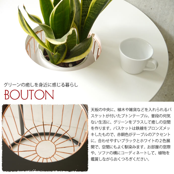 商品 ブトン テーブル550 サイズ 幅550× 奥行550×高さ550mm 素材 天板:MDF、ラッカー塗装(艶なし) フレーム:スチール(紛体塗装) バスケット:鉄線(ブロンズメッキ仕上げ) 生産 台湾 組立式 - 備考 天板中央に鉢植えを置くバスケットが付いた、ブトンシリーズ。