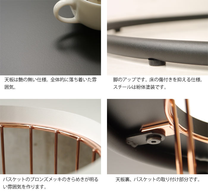 バスケットは鉄線のブロンズメッキ仕上げで、赤銅色にきらめく様子は シンプルなテーブルのアクセントになっています。
