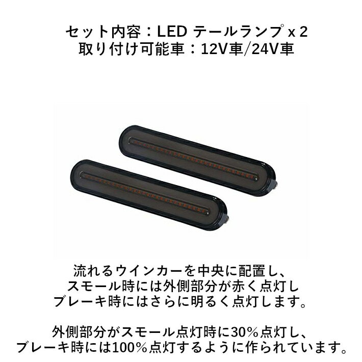 セット内容:LED テールランプx2 取り付け可能車:12V車/24V車 流れるウインカーを中央に配置し、スモール時には外側部分が赤く点灯しブレーキ時にはさらに明るく点灯します。